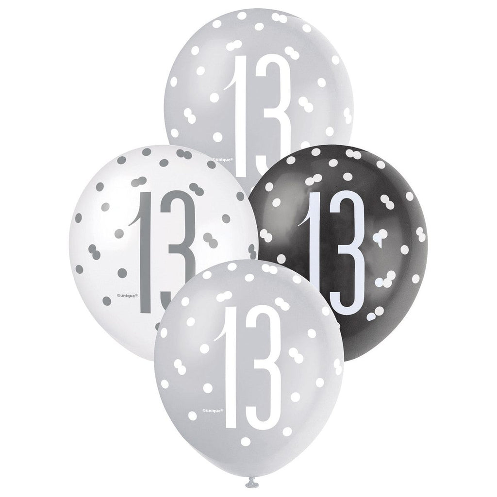 Celebrate the milestone with our Black, Silver & White 13th Birthday Balloons! This pack includes 6 latex helium balloons measuring 30cm (12in) each. Perfect for adding a touch of elegance and fun to your special day.