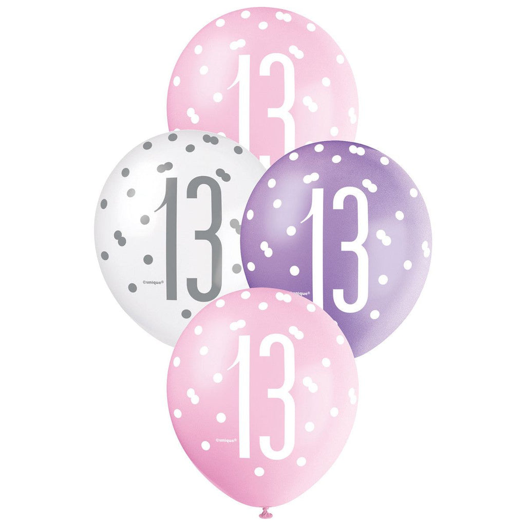 Celebrate your 13th birthday in style with our Pink, Purple & White Latex Balloons! Each pack includes 6 balloons that are 30cm in size (12"). Add a touch of fun and color to your special day. Let these vibrant balloons be the perfect addition to your birthday decorations.