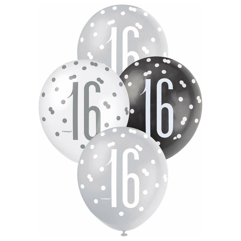 16th Birthday Latex Balloons - Black Silver & White