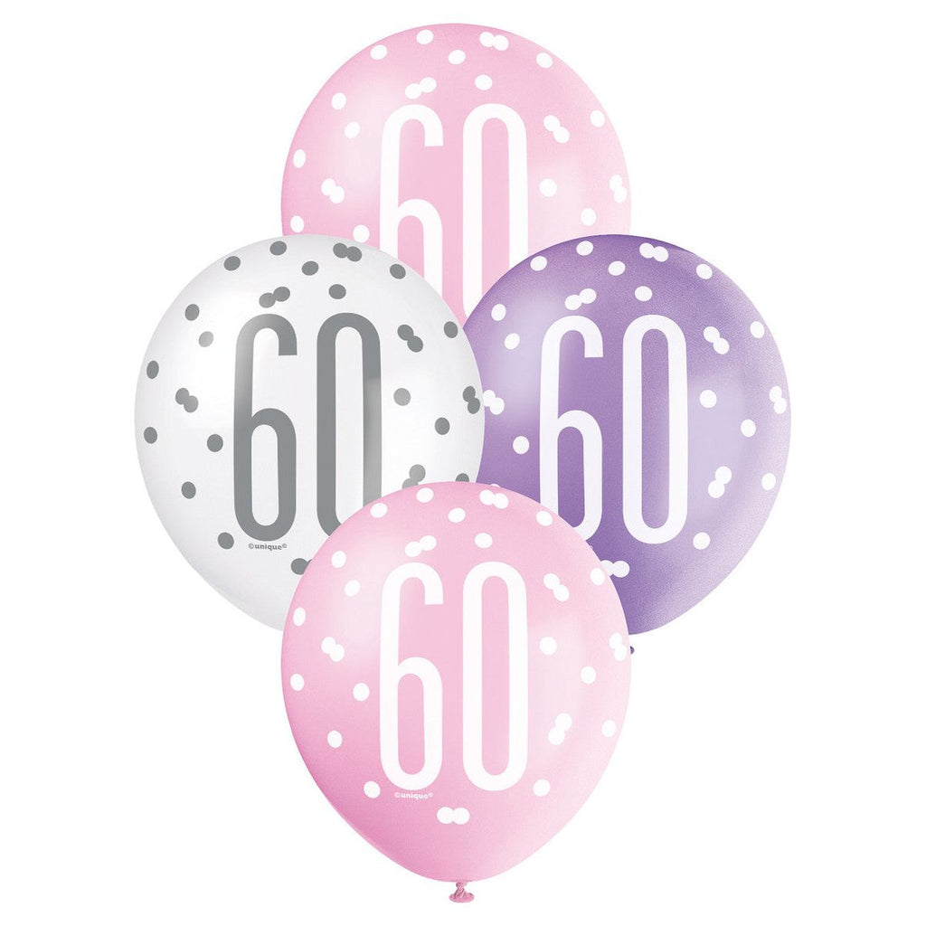 60th Birthday Latex Balloons - Pink, Purple & White