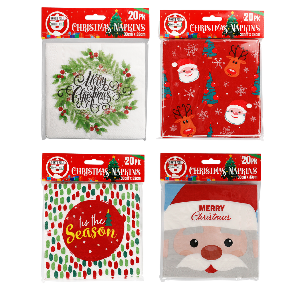 - Transform your holiday table into a festive extravaganza with our Christmas Napkin Pk20! Each pack includes 20 napkins featuring beautiful Christmas-themed designs. Perfect for adding a touch of elegance and holiday spirit to your dining experience.
