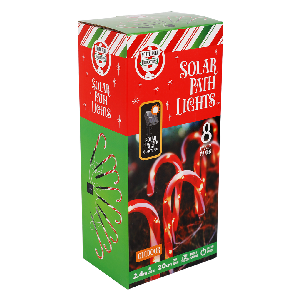 Light up your holiday season with our Christmas Solar Cane Path Lights! This 8-piece set is powered by solar energy, saving you money on energy costs. With a unique and festive cane design, these lights will add a touch of charm to your outdoor decorations. No installation or wiring required - simply place in your desired location and enjoy the warm, welcoming glow. Make your home shine this Christmas!