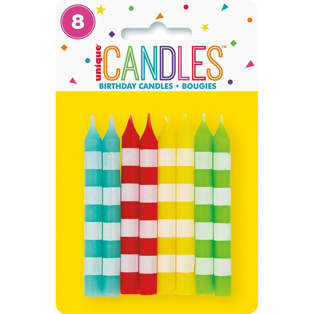 Brighten up any birthday celebration with our Striped Birthday Candles. With a variety of fun, assorted colors in each pack, these candles are sure to add a festive touch to any cake. Each pack includes 8 candles, making them perfect for any size of celebration. Order now and make your next birthday one to remember!