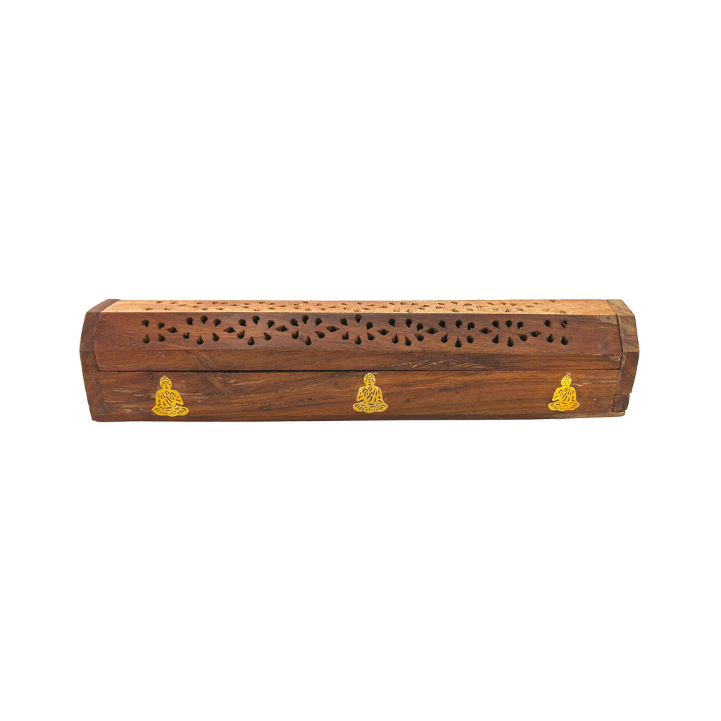 Create a serene sanctuary in your home with this beautifully crafted wooden incense box, crowned with an elegant brass Buddha figure. This sophisticated storage solution keeps your incense collection organised while serving as a striking decorative accent that inspires tranquility and reflection. The warm wood tones paired with gleaming brass detailing bring warmth and spiritual grace to any room. Whether you're a meditation enthusiast or simply seeking to enhance your space with mindful décor, this piece seamlessly merges functionality with artistic beauty, making it an investment in both your wellness routine and your home's aesthetic appeal.